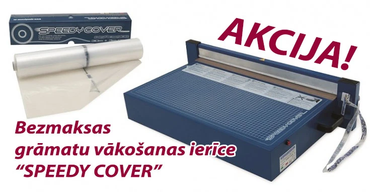 Vēlamies jūs iepazīstināt ar jaunu bezmaksas grāmatu vākošanas ierīci „SPEEDY COVER”! Uzsākot sadarbību, Jūsu rīcībā bez maksas tiek nodota vākošanas ierīce „SPEEDY COVER”. Jums ir jāmaksā tikai par vākošanas plēvi, kura ir pieejama ruļļos. Ruļļa izmērs ir 33 m x 52 cm (var ievākot 109 grāmatas, ja grāmatas izmērs ~A4), cena vienam rullim 51,42 EUR ar PVN. Minimālais daudzums ir 12 ruļļi gadā (pastāv iespēja kooperēties vairākām struktūrvienībām un tādējādi nopērkamo daudzumu uz vienu struktūrvienību samazināt).