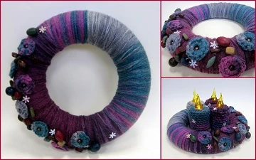 Par pamatu "dzijas vainadziņam" ņēmām polisterola pamanti (apļa formas), pašu vainadziņu notinām ar dziju, kas nokrāsota dažādās krāsās (uztinot to uz vainaga pamatnes veidojas skaistas krāsu pārejas). Vainadziņu dekorējām ar koka pērlītēm, dekoratīvām sniegpārsliņām un taborētiem ziediem! Mūsu dzijas vainadziņu apskati šajā galerijā.
