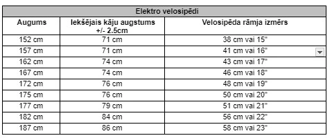 Vecums | Augums | Iekšējais kāju augstums | Riteņu izmērs |